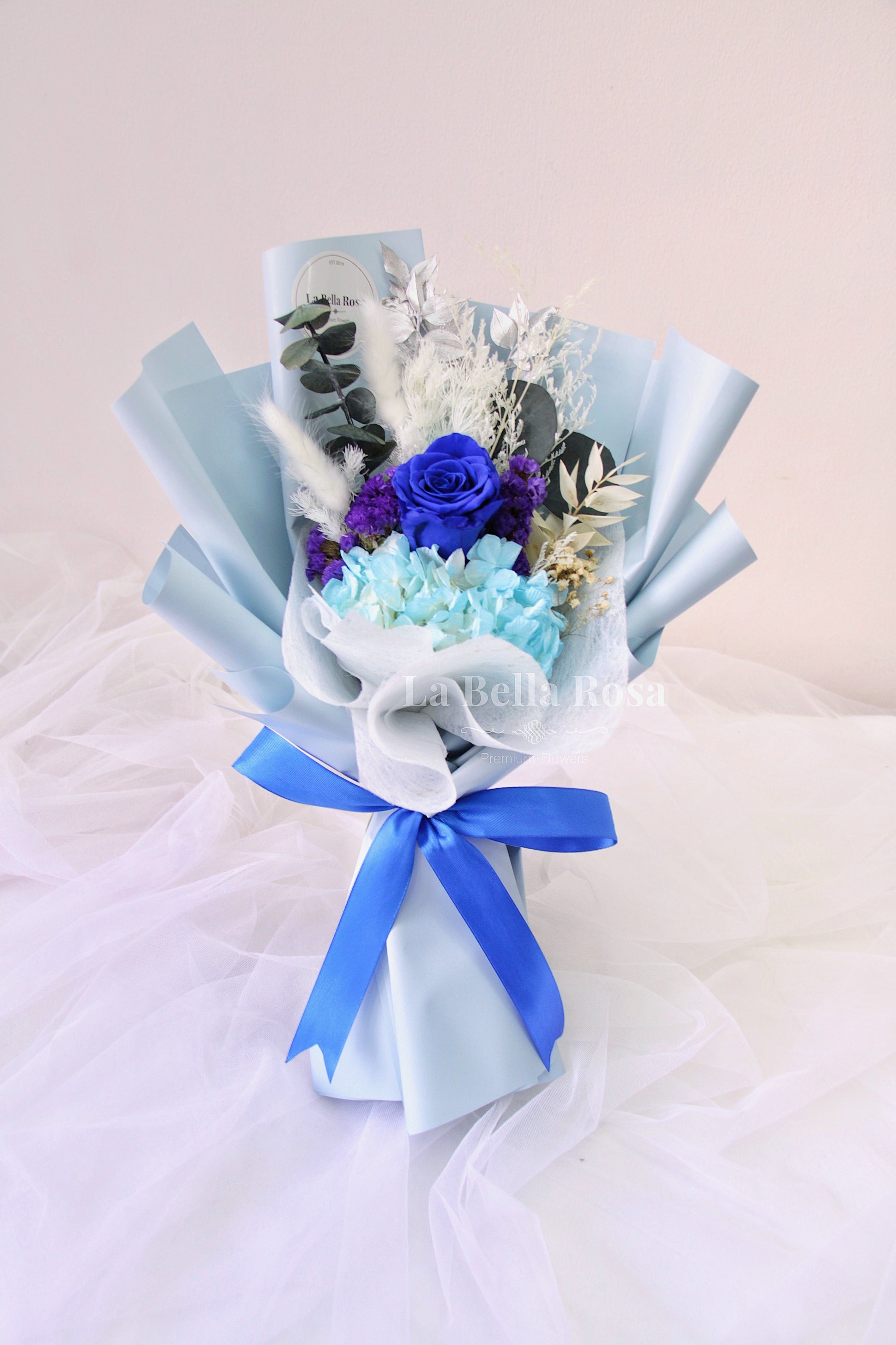 Hannah is a mini dried flower bouquet in royal blue and turquoise shades.