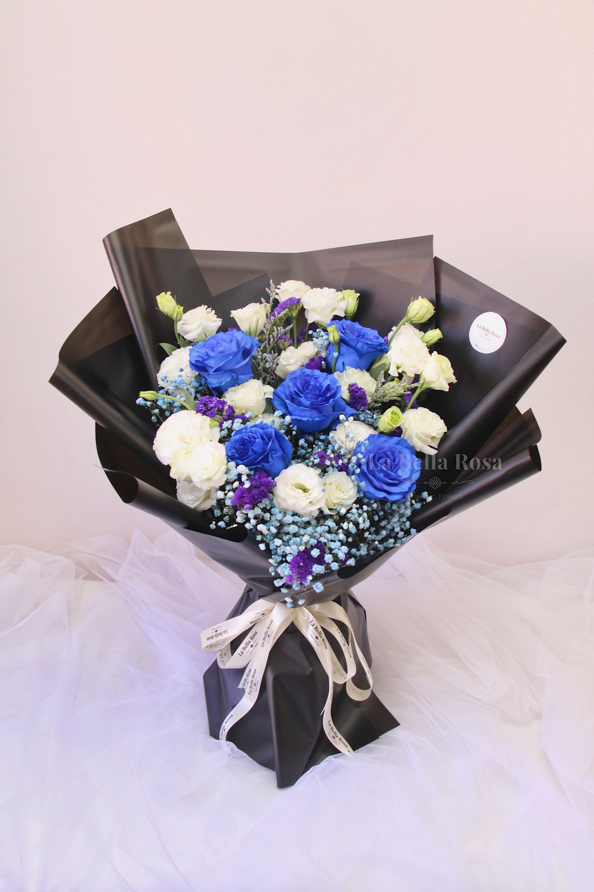 Azure Bouquet features Royal Blue Ecuadorian Roses, Lisianthus, Statice, Baby's Breath complemented with black glassine wrap.