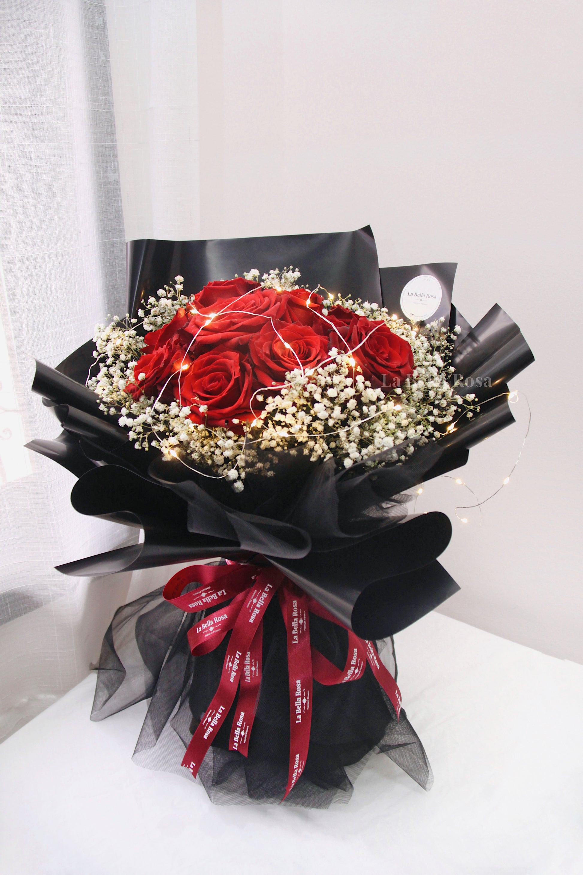 Express your loved the grandest way with our Deep Romance Bouquet featuring a large bouquet of Ecuadorian Roses embraced by heavenly Baby's Breath embellished with fairy lights.