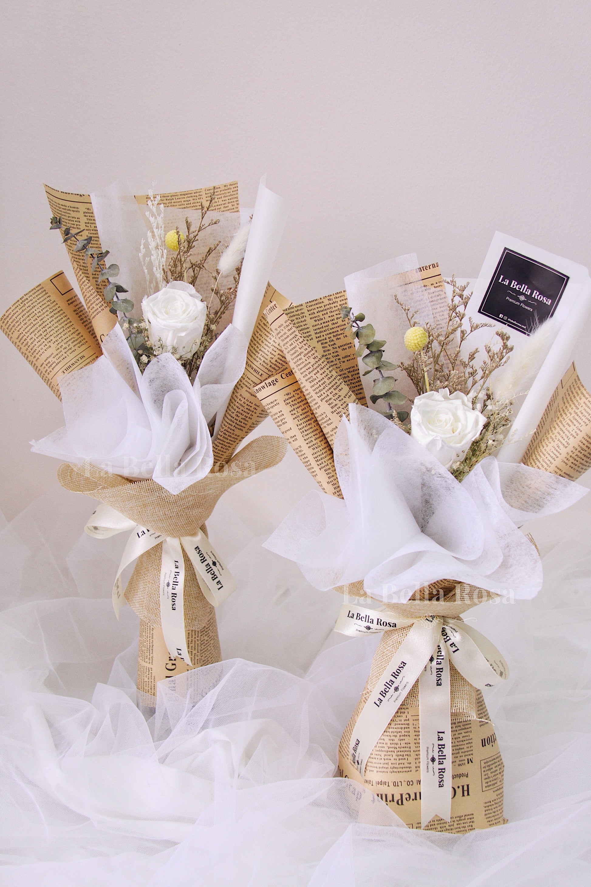 Khaki is our neutral and earthy mini dried flower bouquet in featuring a white preserved rose.