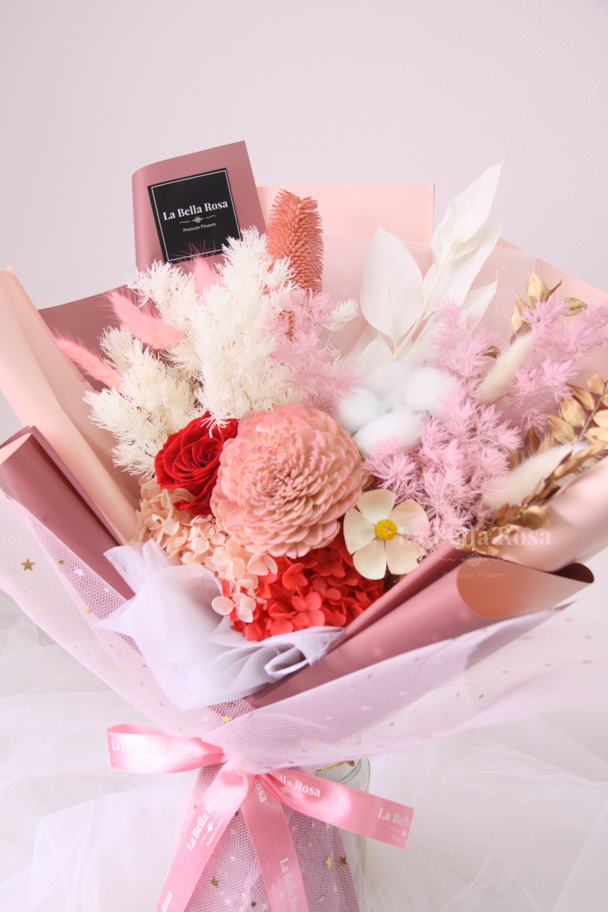 Our Love Dried Flower Bouquet features elegant shades of pink, red, and white that evokes romance and love.