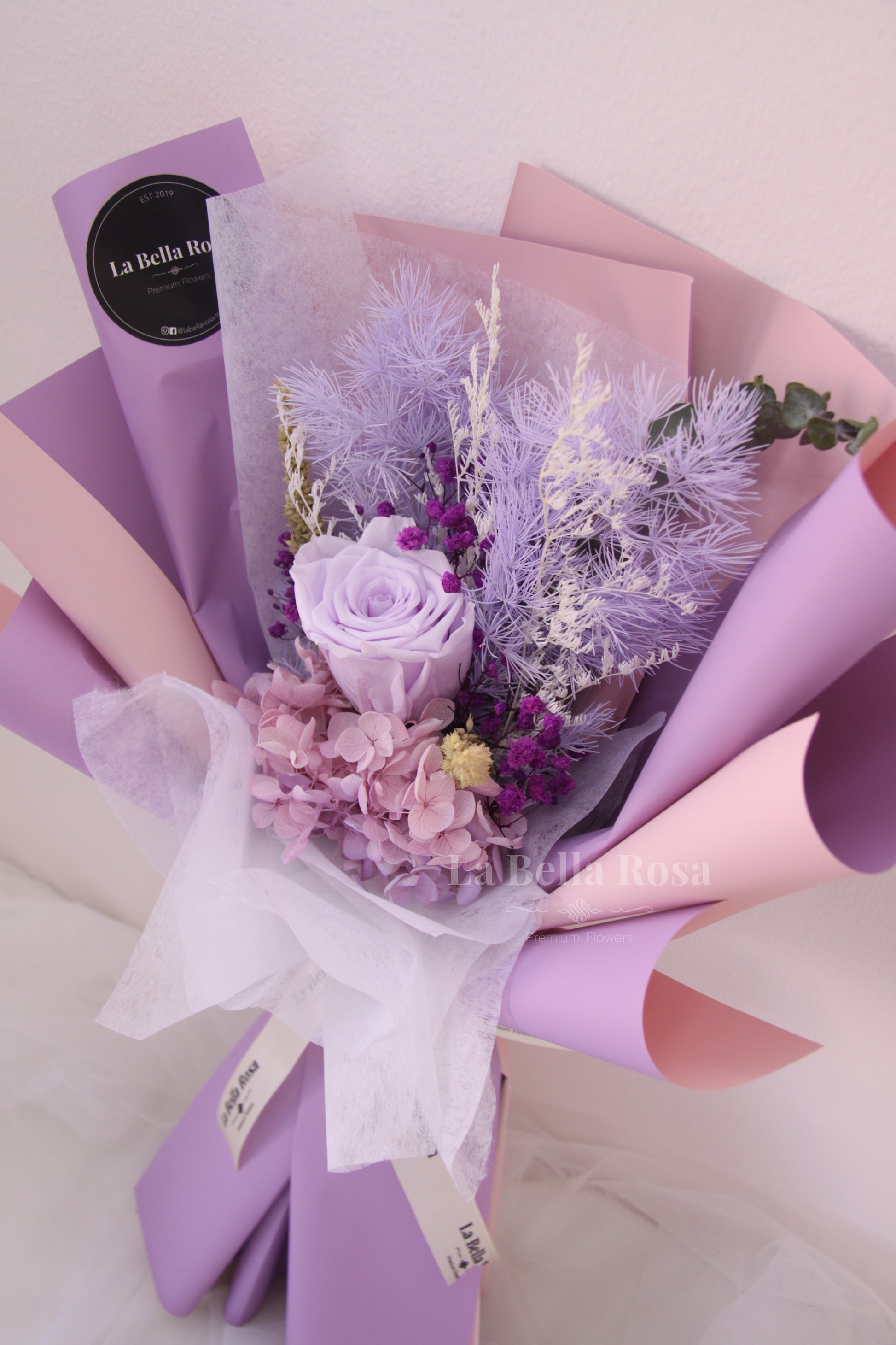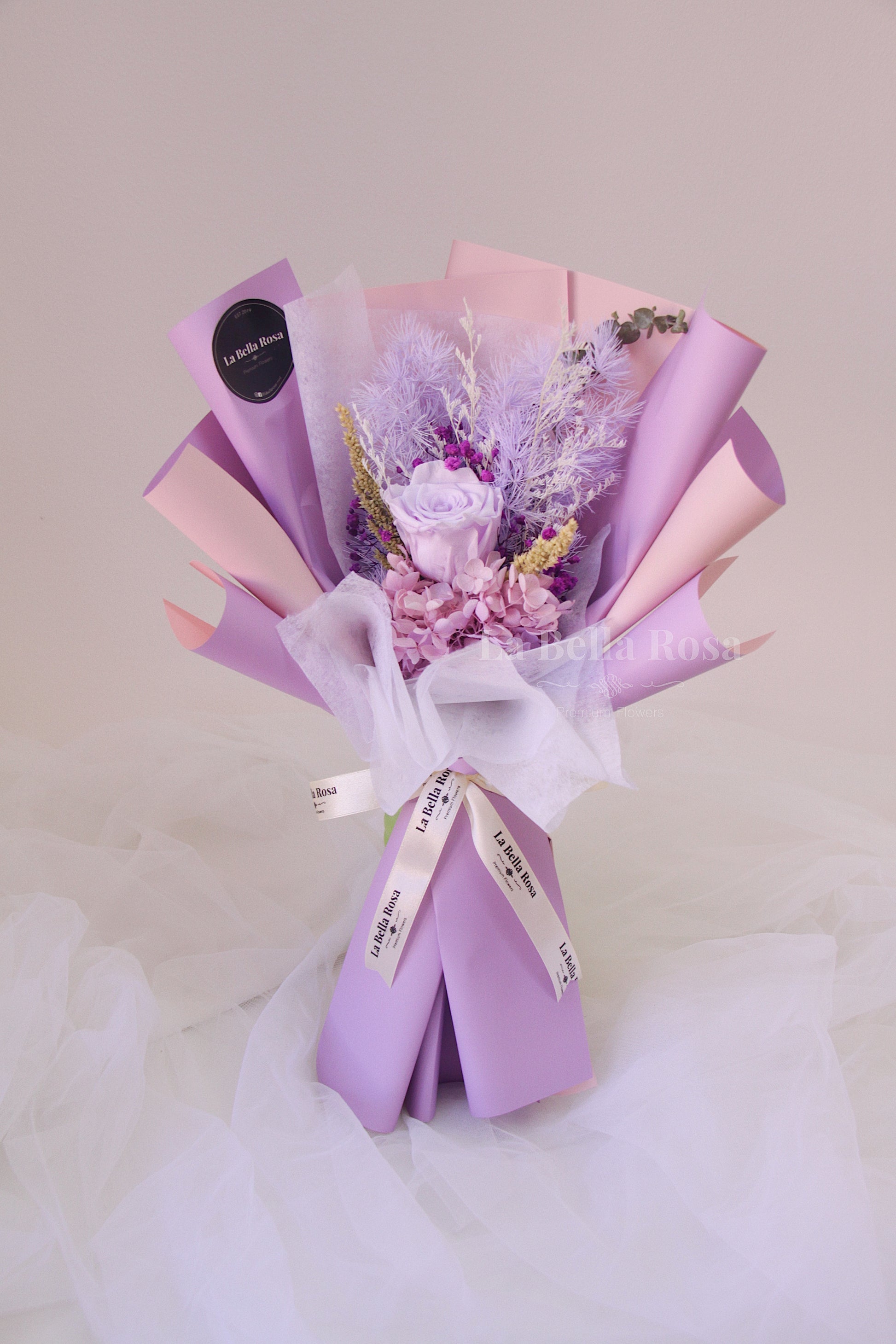 Make her swoon with our Mauve Bouquet featuring elegant dried flowers in purple and mauve tones with a purple preserved rose.