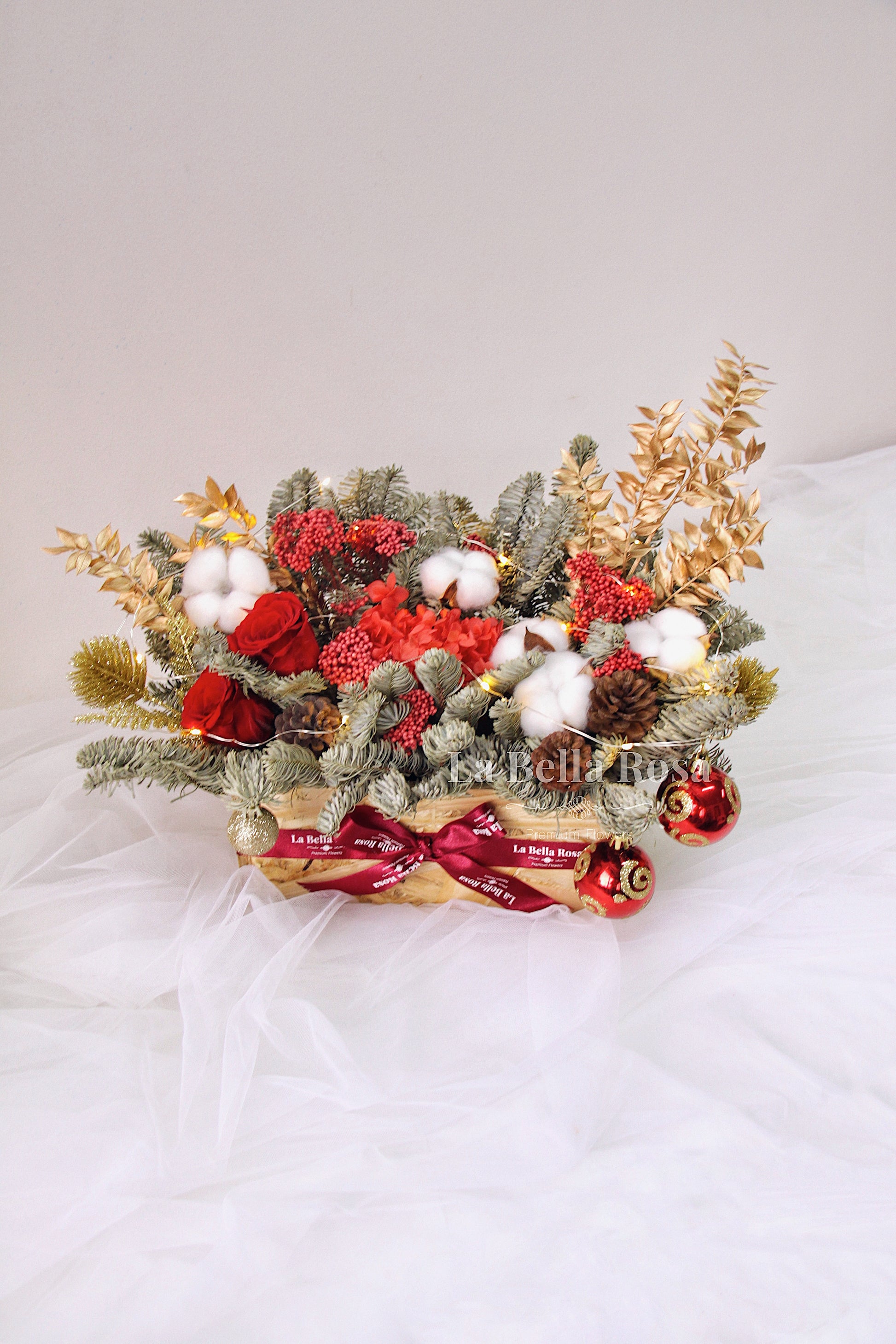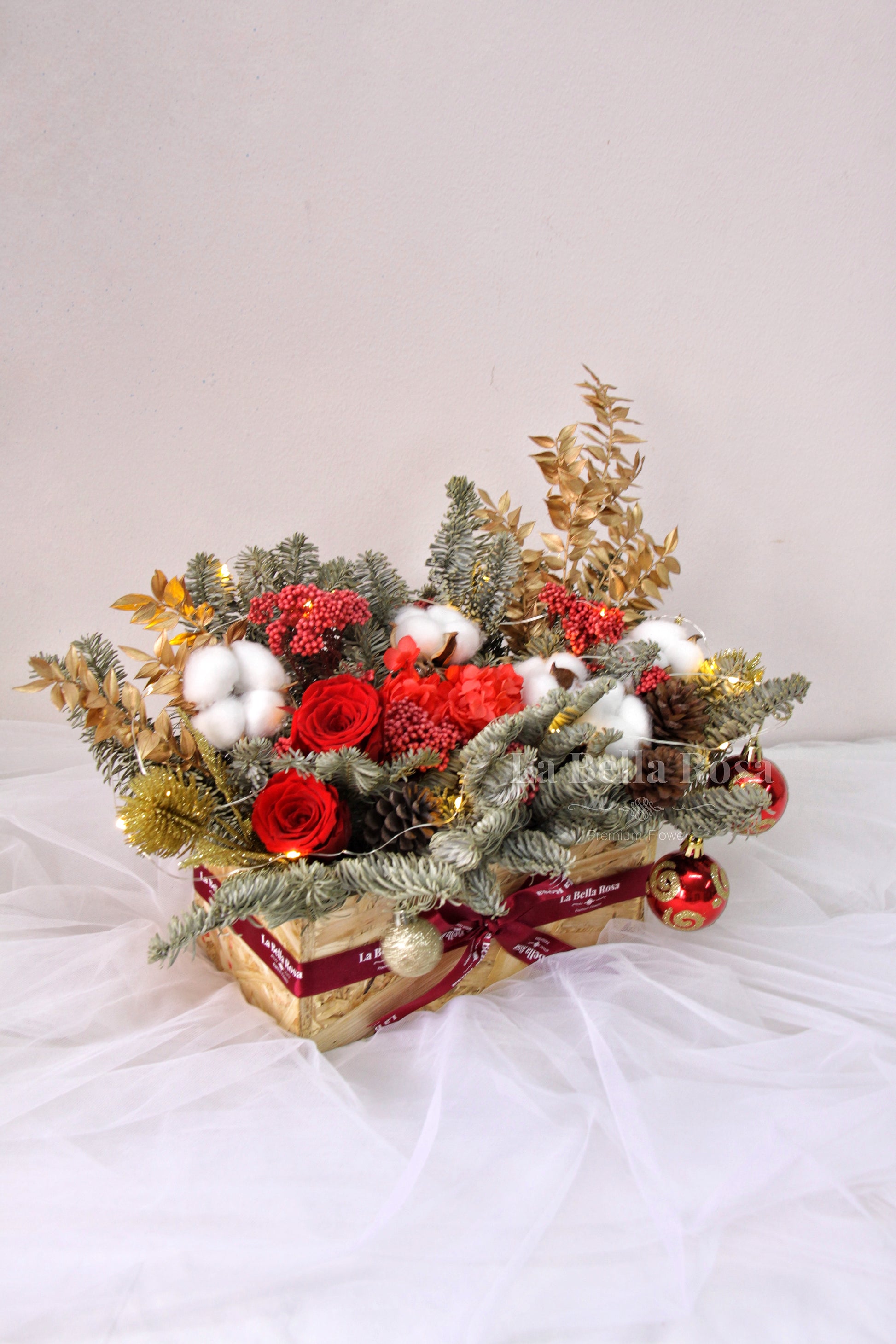 Santa's Box Centerpiece features premium dried and preserved flowers embraced with real pine branches and Christmas ball ornaments.