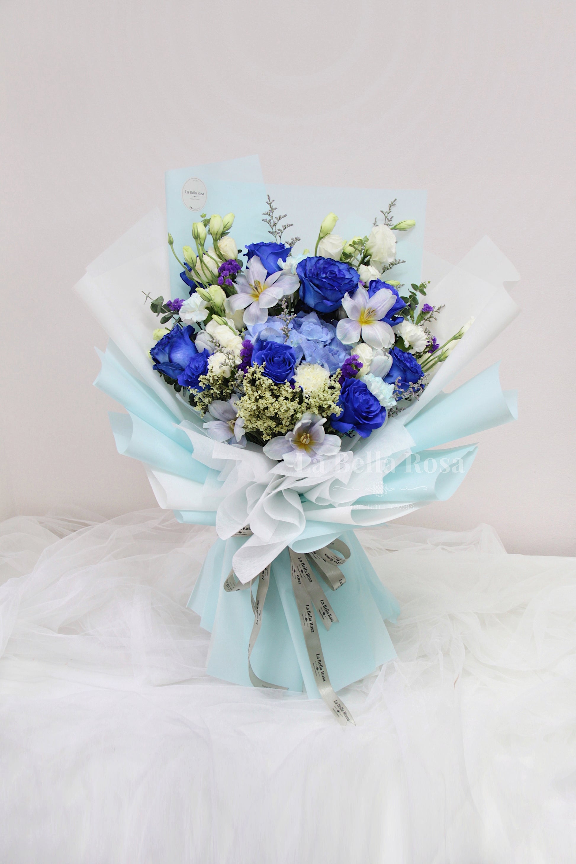 Sapphire Bouquet features Royal Blue Ecuadorian Roses, White Tulips , Hydrangea, Lisianthus, Carnation, Eucalyptus, Misty.