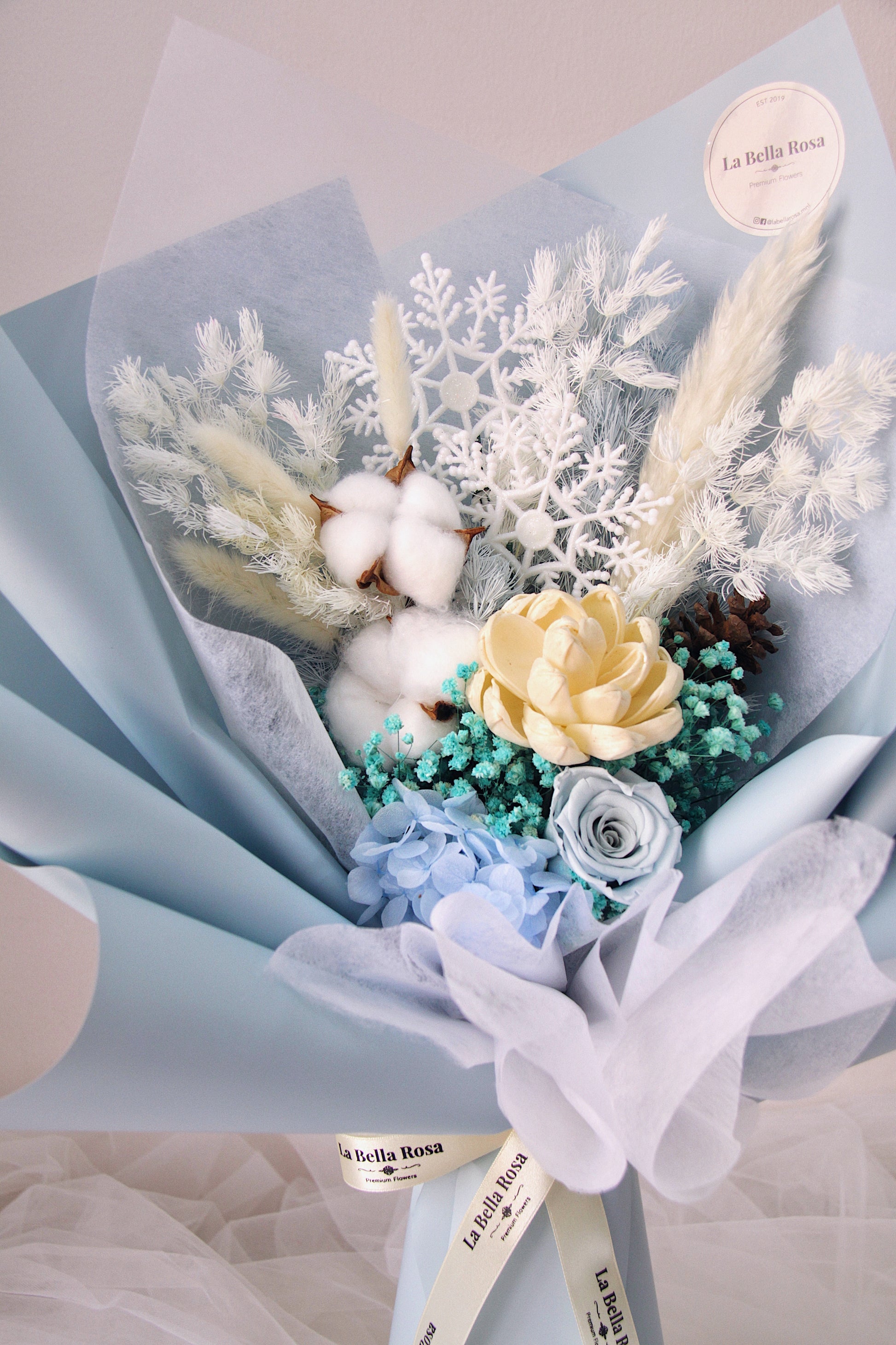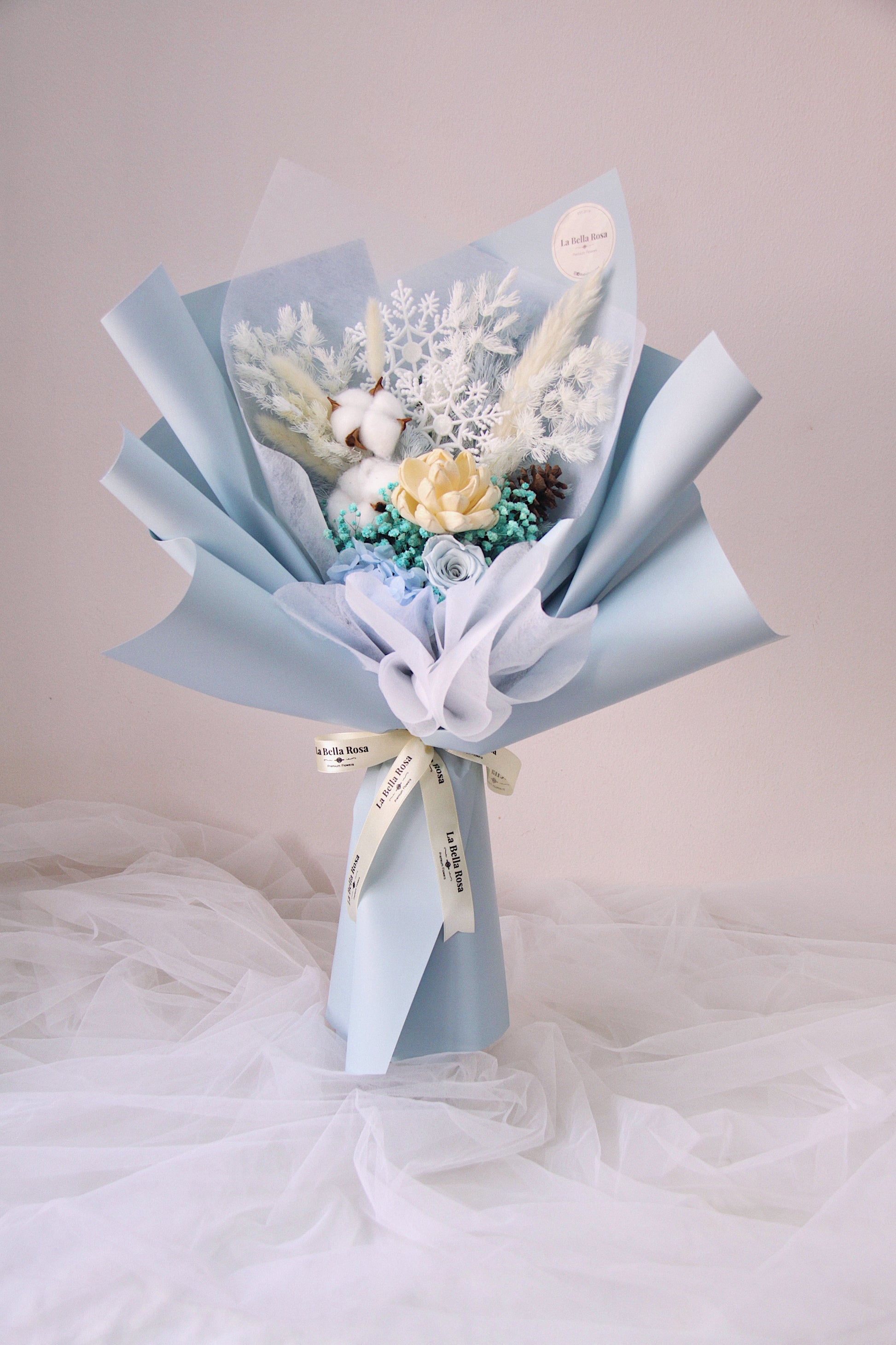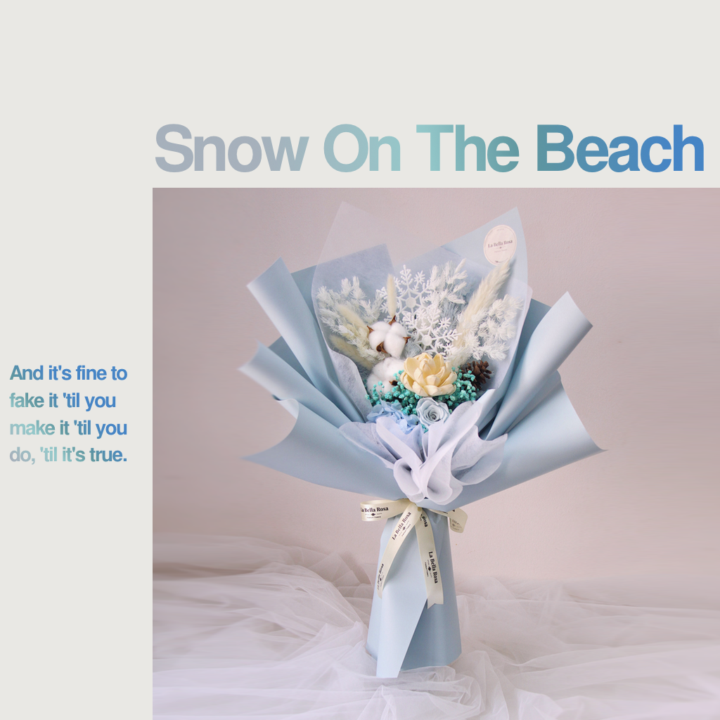 Snow On The Beach Dried Flower Bouquet is inspired by Taylor Swift's hit song "Snow On The Beach" from her latest album "Midnights." Featuring wood sola flower, cotton flower, pastel blue preserved rose, hydrangeas in pastel blue, and a variety of fillers and foliage.